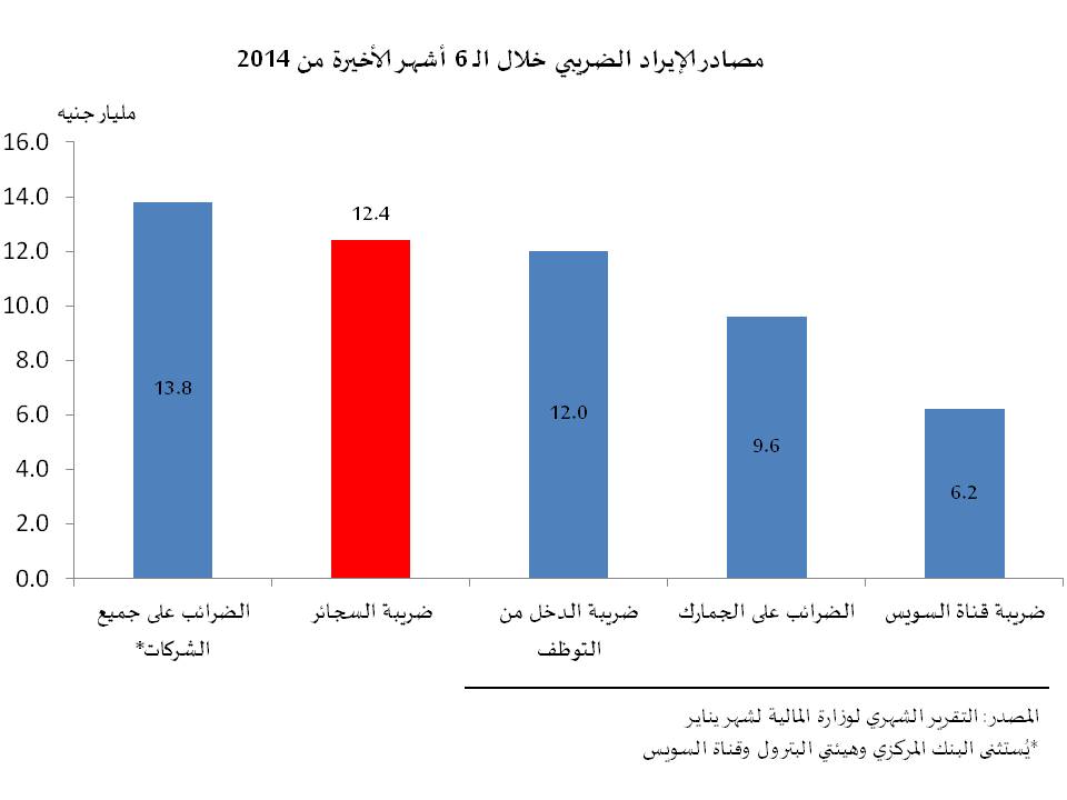 وتتجاوز إيرادات الضريبة على السجائر إيرادات الضرائب على الدخول من التوظف البالغة 12 مليار جنيه، والضرائب على الجمارك البالغة 9.6 مليار جنيه.