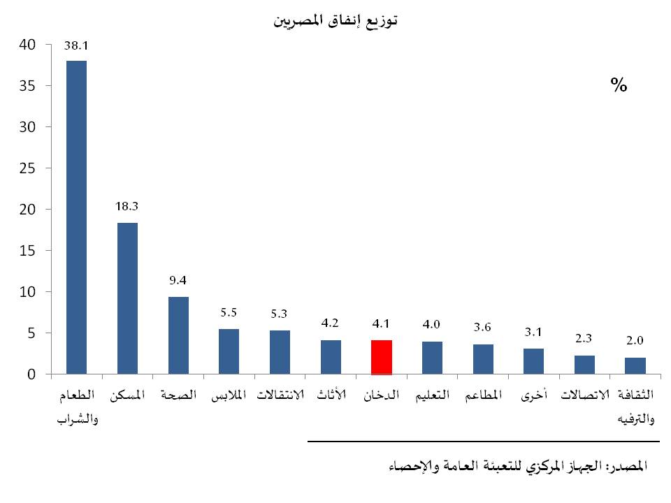 ويوضح الجهاز أنه كلما زاد الفقر زادت نسبة الإنفاق على الدخان، حيث ترتفع نسبة الإنفاق عليه في الريف وبين مستويات الدخول الأقل وفي الصعيد.