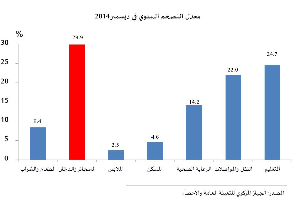 وبينما بلغ معدل التضخم السنوي 10.1% في ديسمبر الماضي، فإن تكلفة السجائر والدخان ارتفعت على المستهلكين بـ 29.9%، ما يقارب ثلاثة أضعاف المعدل العام، متفوقة على مجموعة المسكن والمواصلات والطعام والشراب.