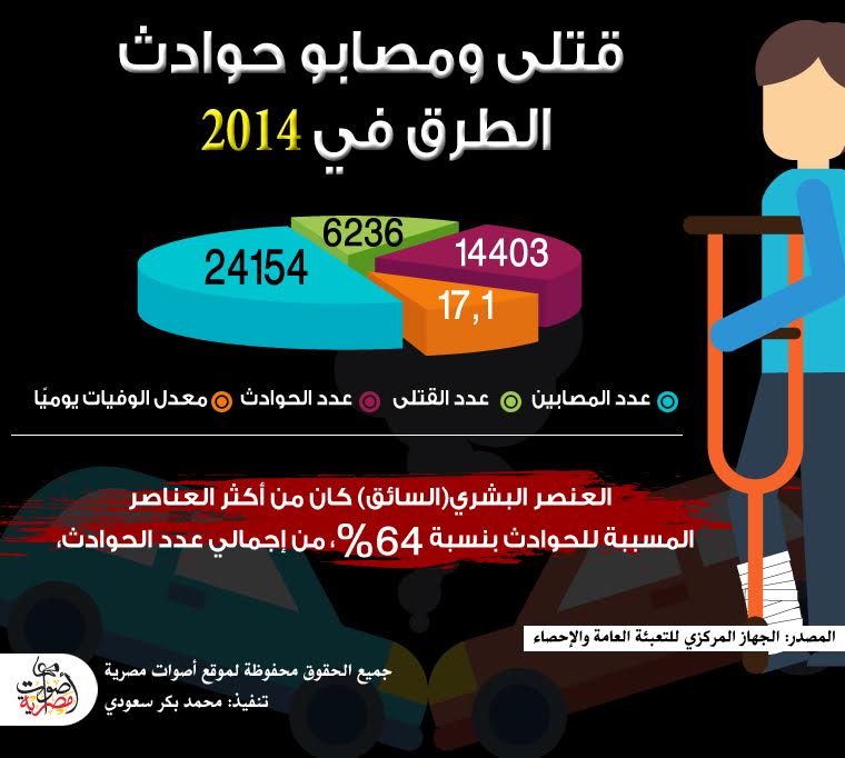 معد التحقيق تتبع المسار الزمني للوفيات الناتجة عن حوادث المرور بحسب احصاءات رسمية، ففي العام 2013 قدرت منظمة الصحة العالمية عدد القتلى نتيجة حوادث المرور في مصر بـ 13 ألفا فيما قدرت المصابين بـ 60 ألف مصاب، وبمعدل وفيات وصل إلى 35 قتيلا يومياً.