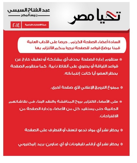 فى منتصف ليل الثانى من مايو 2014، كان المشير عبد الفتاح السيسي يتواصل مع المواطنين لأول مرة عبر حسابات فيس بوك وتويتر والبريد الإلكتروني، بعد تدشين حملته الانتخابية هاشتاج # تحيا مصر، وصفحة "عبد الفتاح السيسي" على فيس بوك، ولعبت حينها دورا رئيسيا في دعم ترشحه للرئاسة، والرد على تساؤلات المتابعين، ويقترب عدد متابعي صفحة "عبد الفتاح السيسي" من ستة ملايين. وتسمح الصفحة لمتابعيها بكتابة التعليقات فقط على الأخبار المعلنة ولا تسمح بالتدوينات. وتضع الصفحة رابطاً لقواعد الصفحة من خمس نقاط تدعو فيها إلى المناقشة والنقد البناء، وترفض الألفاظ النابية.