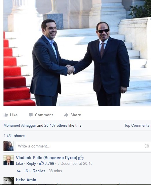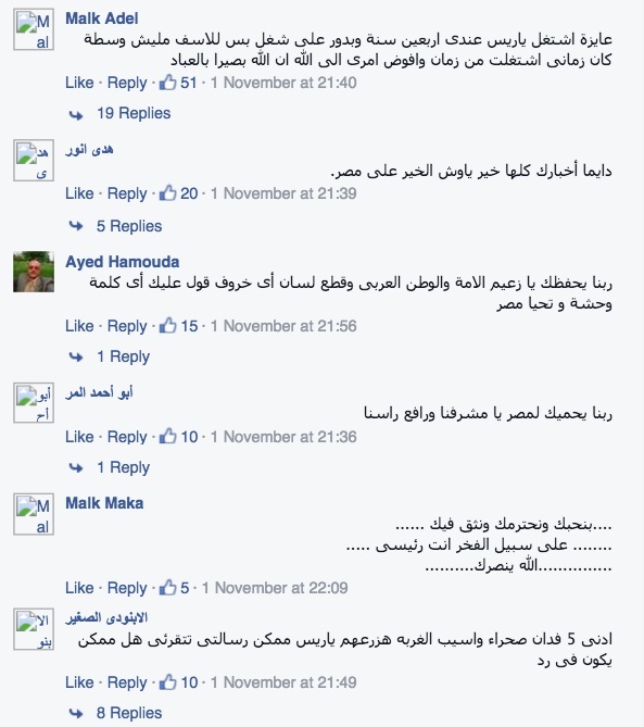 تقترب التعليقات على زيارات الرئيس إلى العشرة آلاف، ويغلب عليها التحية والدعاء للرئيس. استخدام الدعاء فى التعليقات، ظاهرة منتشرة على جميع صفحات فيسبوك كما ترى د. هدى ذكريا، "وهذا يظهر حالة من البحث عن الأمان، وعن تحقيق الآمال".