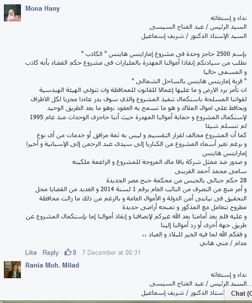 في الأول من نوفمبر، نشرت صفحة "عبد الفتاح السيسي" على فيس بوك خبر موافقة الرئيس على إنشاء أضخم مجمع للأسمدة الفوسفاتية والمُركبة في مصر بمنطقة العين السخنة. توالى بعده ما يقرب من خمسة عشر ألف تعليق على القرار؛ كان أحدها "شابوه علي القرار ده يا رب الدولة تأسس 20 مصنع للأسمدة والأسمنت وغيرها".